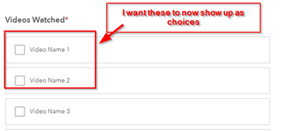 Subsequently, in my Dashboard, i am showing this information, but would like to provide them with a link to the survey - with most of the data already filled in.  I have accomplished this using URL parameters, but what I cannot figure out is, if they watched video 1 and video 2 on a certain piece of equipment, how to eliminate those choices on this newly linked URL?  So they can only select videos they have not already watched and acknowledged.