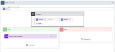 As a result, we need to tell Power Automate what to filter out so it doesn't create duplicates. Luckily, this is pretty simple: Inside your nested repeat, use a Condition to compare the parent's uniquerowid to the child's parentrowid, then put your tasks into the Yes side of the Condition.