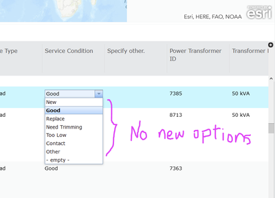 After adding new options to several questions in Survey123 Connect, to an already published survey, and republishing the survey, the new options don't show in the Data Table field column in survey123 website.