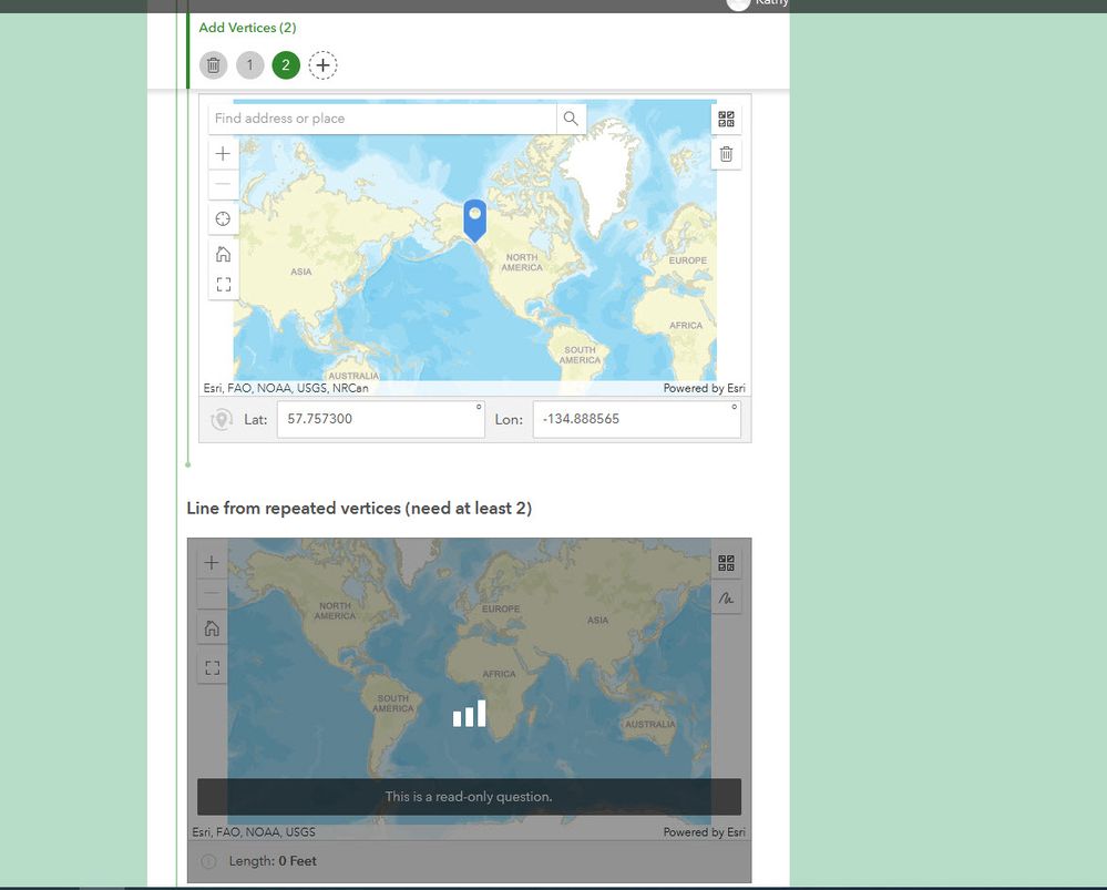 I would like to have a survey123 web form a user can input two coordinates and have a line created between the two points with the line distance shown.