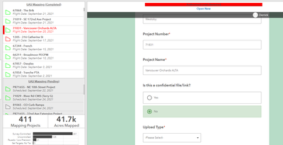 Web app / dashboard with map featuring a region/district dataset. Survey form embedded in the web app/dashboard to capture information to populate form fields.