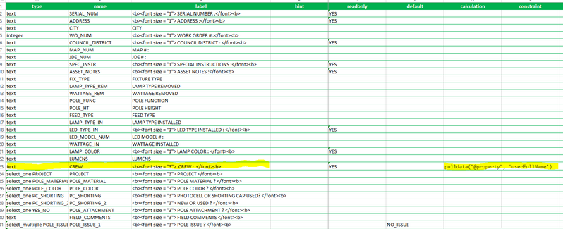 I am trying to pre-populate a "FIELD CREW NAME:" field with first and last name of the user signed in but I am unable to get it to work. Currently I am using "pulldata("@property", 'userFullName')" but it returning "UNKNOWN" in the field. I am the one signed in so I would think it would return my name. I have the "bind::esri:parameters" field set to "calculationMode=auto". The goal here is to eliminate as many clicks as possible so this would be very nice to know who submitted the data without having them select from a drop down.