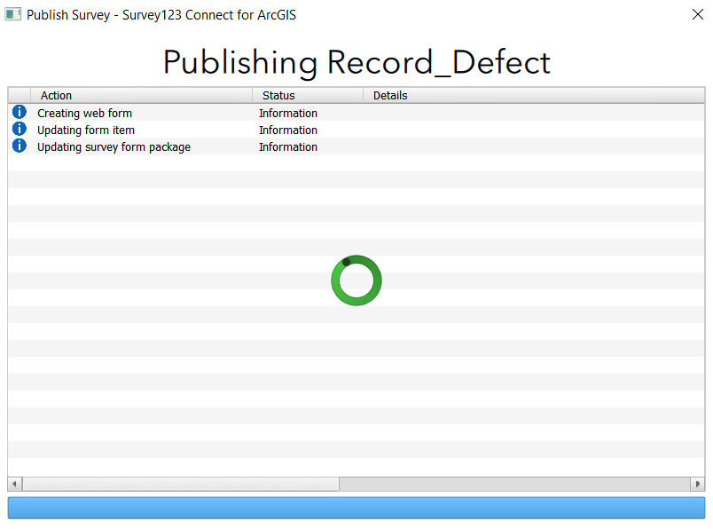 Hi all. I have a survey built using a feature layer. I published this a while ago and everything is working. I have a choice list populated with some staff names. I added a name to this list and tried to publish it again. Everything goes well, until it hangs at the "Updating survey from package" bit. Have anyone experienced similar?
