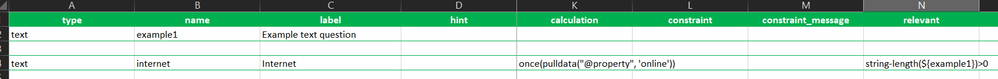 The function pulldata("@property", 'online') returns 'true' if the device is connected to the internet and 'false' if it is not. The default behavior is that the value updates as the network connectivity of the device changes. Is there a way to have it retain the value from one moment in time? I have a repeat with questions that pull data from a feature service and I want to retain the 'online' boolean value that represents network connectivity at the moment the data is pulled from the feature service. I haven't been able to figure out a way to do that. I tried the once() function but that didn't seem to work. Thanks in advance for any suggestions!