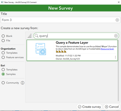 Please check out the Query a Feature Layer sample in Survey123 Connect for more information on the pulldata('@layer') syntax: