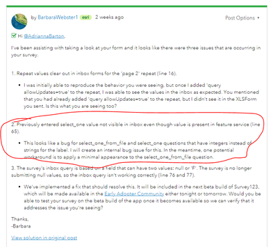 However, I'm still trying to work through some issues where data is not displaying despite having that expression in the parameters column. Do you know if there is some known limitation with select_one questions and the inbox? The data that is not displaying is the species name, which is selected from a drop down list.