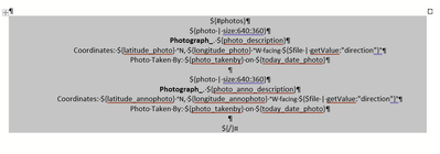 I did some testing, and specifically I think it's an issue with your photos repeat syntax. Put the ${#photos} text within the same table as the rest of the photo repeat information and see if that fixes it for you.