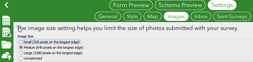 I am unable to find information on how I can set maximum file size on photos when captured on Survey123 forms (without using IrfanView). Is there a way to set this constraint through Survey rather than changing the photo resolution from the app itself before capturing photos? Or perhaps what would be really handy is for Survey to resize (or rather downsize) the photo to the set max upon uploading.