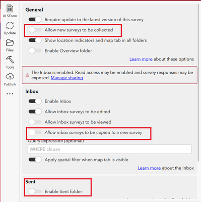 I have a survey where the "Sent" folder is disabled, the "Inbox" doesn't allow new submissions, and "Allow new surveys to be collected" is disabled. This means you can only edit what is already in the Inbox. However, when you download a survey, it ignores these settings and opens as a new survey, thus allowing submission that should be denied.
