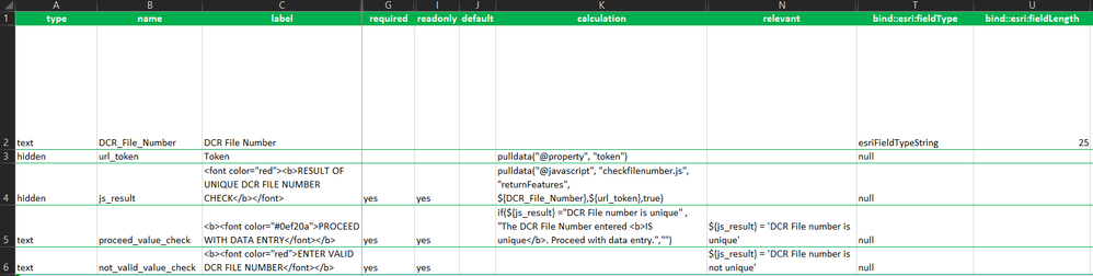 Next, I configured the XLSForm - here is what all of the populated columns look like (I hid all of the empty/non-relevant columns to fit this into one image):