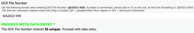When a unique DCR File Number is entered, this message appears and the user is able to submit: