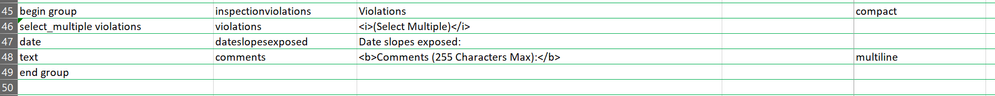 I've managed to get the rest of the form set up properly and am pretty please with it, however, I am truly stumped on how to make the form populate the cells next to the violations section of the inspection form if they are selected in the field.