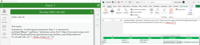 I have a field titled "user_id", which is manually entered by the user. If there is a match I would like to use this entry to pull attribute data from a hosted table (see rest endpoint below) to auto populate the second field with the data in the "name_first" field on my survey. My current code does not return anything. Please advise: