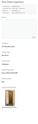 I created a "CRAWLSPACE_PHOTO" field but no data is in it. However, I can see the photo in survey123 under the "Data" tab. I know the report uses keywords so I think its a syntax issue where I am just not calling the photo up correctly.