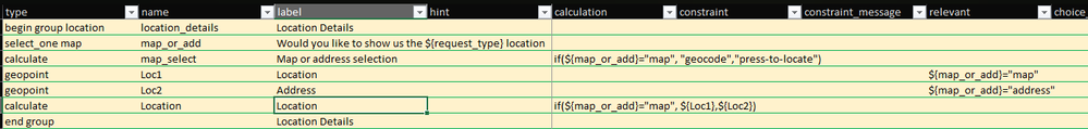 I am trying to provide two different options for my residents to select a location. Either using the geocode search appearance which will let them type in an address or using the map selector. If I put both into the appearance field, then it defaults to just entering an address. If I try to use a calculation or reference a calculated value, then it defaults to press-to-locate. If I have two geopoint types in the same survey conditional on what the user picks I can't publish. I also can't have a repeat question to allow for two geopoints because this is built on an existing service. And I know that they can search for an address in the map but it is not as slick as the geocode address search so I would like to default to that if possible.