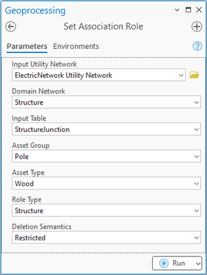 The first step is to set the association role for poles to allow features to attach to them. This is done by using the Set Association Role tool to assign the structure role.