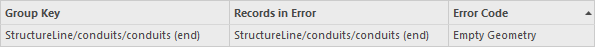 The most common resolution to this error is to manually draw the geometry of the feature, if you can identify its location. If you wish to automatically delete this feature through an action in the error resolution tool, find the row in the Error Resolution table with this error code and set its action to Delete all.