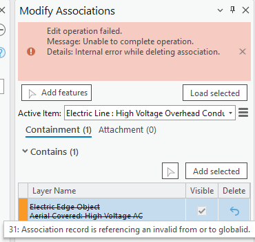 An Electric Line feature has made it into our default Utility Network. The line feature cannot be deleted because it has an association, contains an Electric Edge Object. The association cannot be removed because of an error "31: Association record is referencing an invalid from or to globalid". This sounds like an issue related to the line feature having zero geometry.