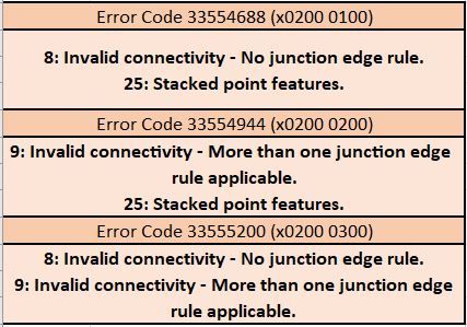 When we analyze Dirty Areas, besides checking the Error(s) field of the polygon in a pop-up (for example... 9: Invalid connectivity - More than one junction edge rule applicable.) we also focus our attention on the Error Code. This field, seemingly a bit-wise code, provides additional information that helps us analyze the error. For example, Error Codes 256, 512 and 768 (x100, x200 and x300) are all three about Invalid Connectivity, but with slightly different "flavors":