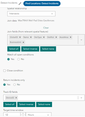 I have a Geofencing analytic that detects vehicles inside Well Pad sites polygons. The feed for vehicles has a track ID and I am joining a few fields from the well pad sites into my output feature layer which is the result of detect incidents. I am currently using a spatial intersect as my open condition. The idea is to eventually report Well pads sites visited by operators and time on site.