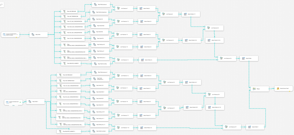 The API returns the data into separate rows for each parameter for a single timestamp, and a few sets of nested JSON that pertain to each parameter type. So the only thing I could think to do is flatten those and then implement a horrendous looking workflow using a real-time analytic (which is mostly horrendous because Join only allows two inputs at a time). I have to do four sets of joins to get everything all back together. Ha!
