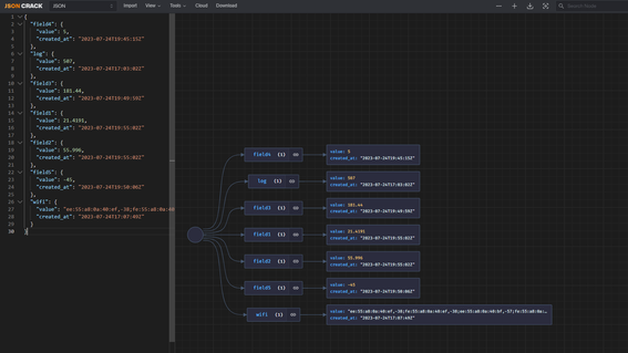 // {\"field4\":{\"value\":5,\"created_at\":\"2023-07-25T11:45:15Z\"},\"log\":{\"value\":507,\"created_at\":\"2023-07-24T17:03:02Z\"},\"field3\":{\"value\":226.4,\"created_at\":\"2023-07-25T12:55:25Z\"},\"field1\":{\"value\":21.5606,\"created_at\":\"2023-07-25T12:55:34Z\"},\"field2\":{\"value\":57.0855,\"created_at\":\"2023-07-25T12:55:34Z\"},\"field5\":{\"value\":-36,\"created_at\":\"2023-07-25T12:50:38Z\"},\"wifi\":{\"value\":\"ee:55:a8:0a:40:ef,-38;fe:55:a8:0a:40:ef,-38;ee:55:a8:0a:40:bf,-57;fe:55:a8:0a:40:bf,-58;02:18:4a:8c:49:62,-61\",\"created_at\":\"2023-07-24T17:07:49Z\"}}