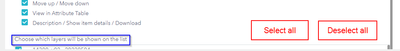 In the Layer widget, all layers are automatically selected at startup of configuring. When you have a webmap with a lot of layers, but only want to include a few layers, it is quite a job to deselect all the non-relevant layers. Which also duplicates and increases when you add more layer widgets.