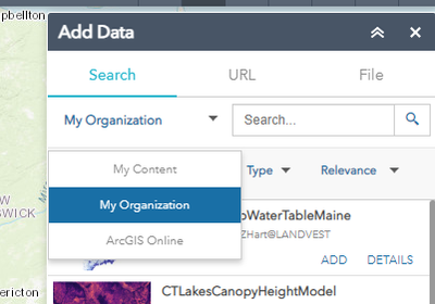 Using the Add Data widget in the Web AppBuilder web app however, there is no Living Atlas to search from: