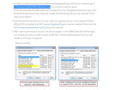 Ran into separate issue with connecting Access to Arc. I found this help article which I think explains my problem. Posted a screenshot of the instructions below and a link to the article. I downloaded the appropriate engine driver (I believe) as it says here. I even restarted my computer after doing so, but the new accdb driver is NOT showing up. See additional screenshots. Maybe the issue lies in the 32-bit/64-bit difference? Any insight would be hugely appreciated.