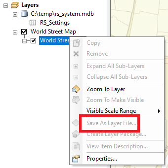 I manually added this basemap to my map, as shown above. When I right-click the World Street Map layer, the 'Save As Layer File' command is disabled. Does anyone know if (and how) I can enable this command?
