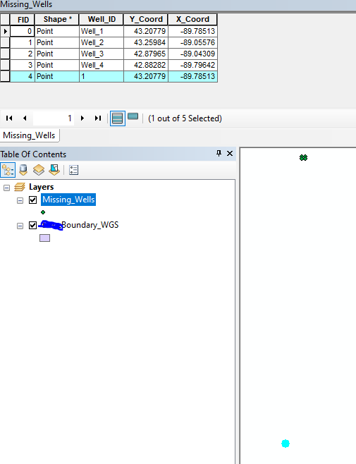 Everything appears to be working correctly, the data table and attributes are correct, the newly added points appear to be correct relative to one another. The issue is when I try to update an existing file. The newly added points are way off somewhere else. In the example here, I tried to add the exact same GPS coords (in decimal degrees) as an existing point. You can see the first entry, the Y_Coord and X_Coord for Well_1 is the same as 1. However the new point is way below the other points.