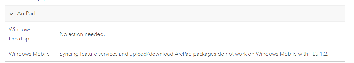 At that time, ArcPad running on platforms that support TLS 1.2, will continue to work with no limitations or change in behavior.
