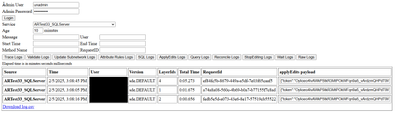 Next we go to the web parser, login using the admin credentials and select the service we want to extract the log from, how long ago we want to query (10 minutes is the default) and click on Attribute Rules log. This will query the admin api for all attribute rules that has been executed in the past 10 minutes and list them as a table.