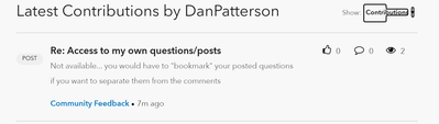 I feel like I am missing something really obvious, but I haven't been able to find a simple "My Posts" or "My Questions" section on here. Under my profile, there's "My Ideas" and also "My Subscriptions", but the Subscriptions section includes everything I've commented on, not just content I've created.