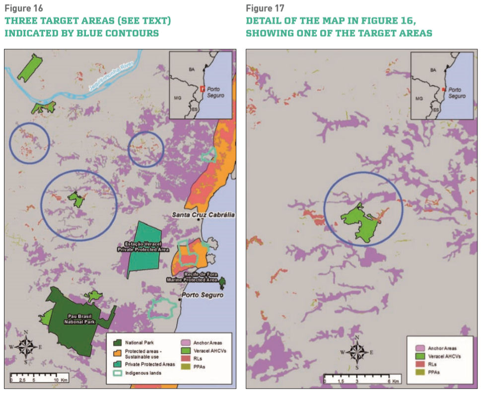 The sustainable forest mosaics (SFM) concept recognizes the multiple roles tropical forests serve around the world. Tropical forests are critical for the global climate, helping mitigate climate change by absorbing and storing CO2 while generating oxygen. They protect watersheds, prevent erosion and soil degradation, cycle water and nutrients, supply nontimber forest products, and serve as habitat for the majority of the world’s known species. Tropical forest areas are also home to substantial forest plantations, which supply an ever-growing portion of the world’s demand for paper, personal goods, and inexpensive wood products. The SMF concept views forests as a “puzzle” of different land uses, working at a landscape scale to plan productive activities while protecting the forest ecosystems and the services they provide. The Sustainable Forest Mosaics Initiative has the goal of increasing the effectiveness of conservation and biodiversity efforts in the forest mosaics that combine remaining native and planted forests. This unique Initiative encompasses three different scales, local, regional, and global. This design builds on ongoing work in one region of Brazil while seeking to expand this successful model to the rest of the Atlantic Forest and other regions of the world where plantation forests have a large footprint in landscapes. The Initiative takes a science-based landscape approach, seeking to guarantee results in an area large enough to benefit a range of species and ecosystems. The Forest Mosaics initiative was launched in 2007 by KimberlyClark, Conservation International, The Nature Conservancy and the Instituto BioAtlântica. Three leading pulp and paper companies soon joined the effort (Veracel Celulose, Aracruz Celulose, and Suzano Papel e Celulose), and several additional partners have since formally joined the Initiative and are working to achieve common objectives. A huge work was developed using GIS tools to assist in this challenge, first to define the places where the monitoring stations must be chosen and to set a timeline for areas prioritizing to restore at the regions that companies operate. A clear and unbiased view of biodiversity changes in the region covered by the monitoring stations was possible by choosing monitoring stations at locations that represent all the types of vegetation and topographies in the region. Also relevant was the establishment of stations along similar types of vegetation and topographies on opposite sides of the geographic barriers existing at the area. The restoration actions will be concentrated in carefully chosen locations, where a positive impact, as large as possible, is expected to restore the connections needed to maintain the gene flow and to promote biodiversity maintenance. Thereby, the prioritization strategies were delineated in the sense of enabling to choose the locations where the restoration and conservation actions will have the greatest positive impact on the landscape and biodiversity structure. In order to define a methodology to define the anchor areas for conservation and restoration, it considered the fact that it is very important to optimize the use of available resources–that will always be limited–in order to generate the greatest possible benefits to the natural ecosystems. This methodology proposes more refined criteria for prioritizing restoration actions in Permanent Preservation Areas (PPA), Legal Reserves (LR) and other types of areas and the criteria to prioritize the areas to restore were established, so that the actions are initiated by the areas that will connect more vegetation fragments when the restoration is complete and so that the greatest restoration benefits are achieved in the first phases of the projects.