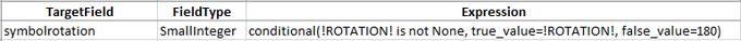 In the example above, the Source field ROTATION is evaluated to detect Null values. If the ROTATION field has a value, then the value will be loaded into the symbolrotation target field. If it is Null, a value of 180 is loaded into the symbolrotation target field instead.