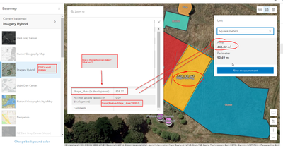 I created a layer in AGOL using the imagery hybrid as my basemap. It has auto-calculated the Shape_Area as it usually does. I then measured the polygon using the measuring tool, and the areas are way out. I'm not sure what coordinate system the basemap is, but going through all the options of measurements in the tool, I can't get one to match it.