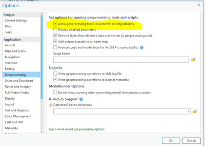In Projects/Options/Geoprocessing I have Allow geoprocessing tools to overwrite existing datasets checked: