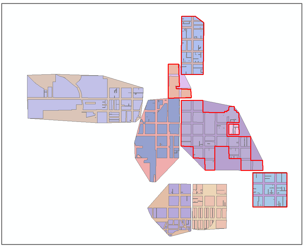 1.  Contact the County Assessors office for the Right-of-Way (ROW) polygons and then use the Merge geoprocessing tool to combine them with the Urban Renewal polygons.  Then Select ones that belong together while in an editing session and use the editing Merge to then come up with one large polygon for each set of urban areas.  This may entail some Cutting of the ROW parts to match the urban areas.