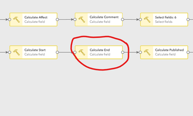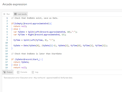 I have a scheduled data pipeline that once a day reads a JSON-file and writes it to a feature service. In the pipeline, I do numerous calculate field where I use Arcade to get the information I need from the JSON-file. In these scripts I use $record. to fetch the information I need ($record.approximateEnd in the example below). The issue I am facing is that some of this information is not always present in the input file. When this happens, the arcade script throws an Execution error - Key not found, and the pipeline does not run/fails (no data is updated). I would like to modify my script so that it first tests if $record.approximateEnd exists. If it does not exist it would create a null value. Any other solution that would prevent my pipeline from failing when data is missing would also work.