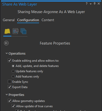 - Operations: Enable Editing on the feature layer (check the appropriate option such as Add, update, delete) and optionally choose Export Data or Export Sync.