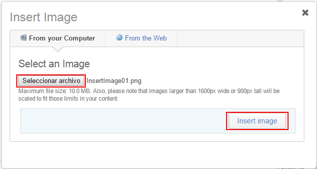 In the popup, select the file (probably from your computer) and click on Insert image: