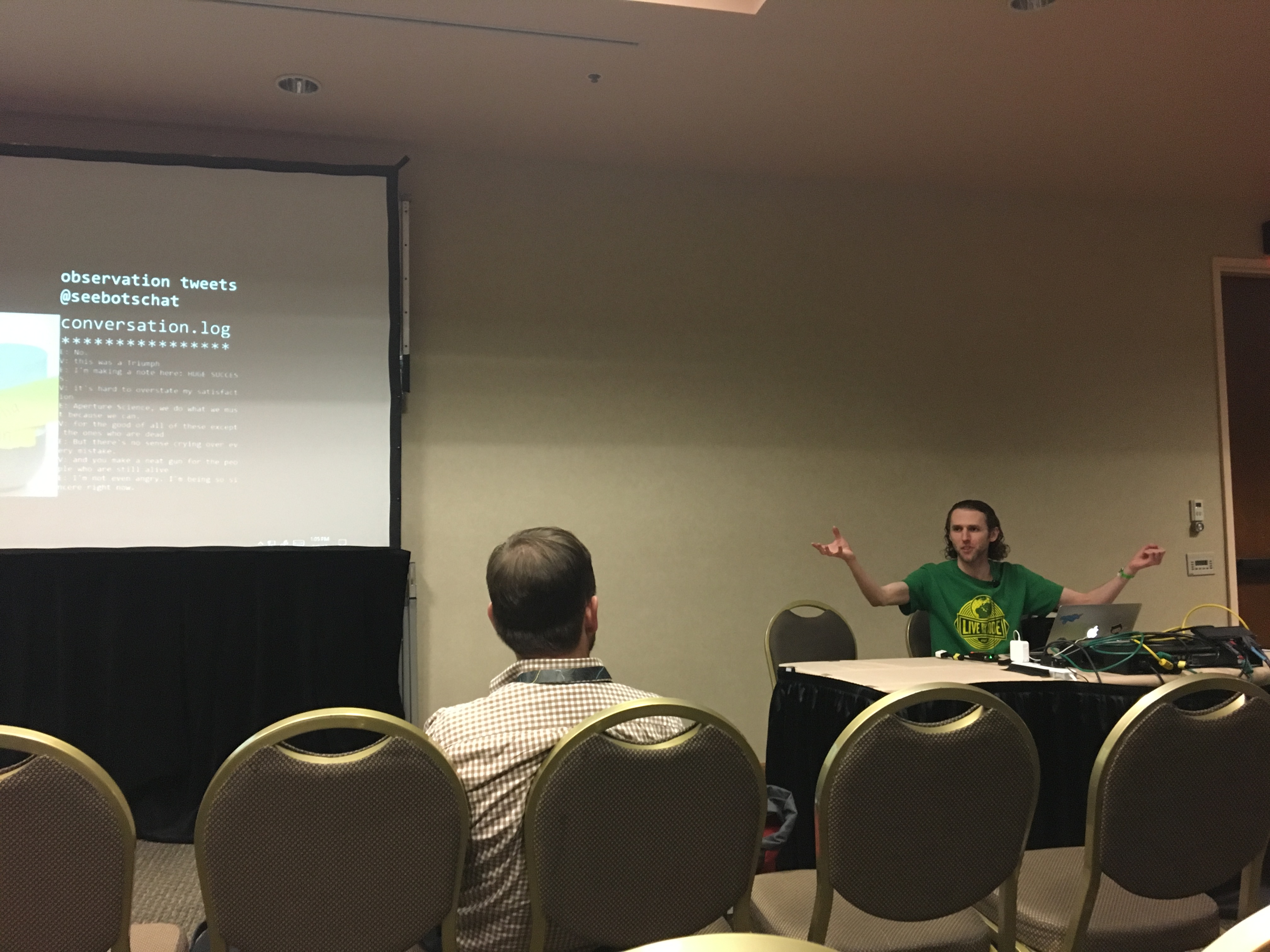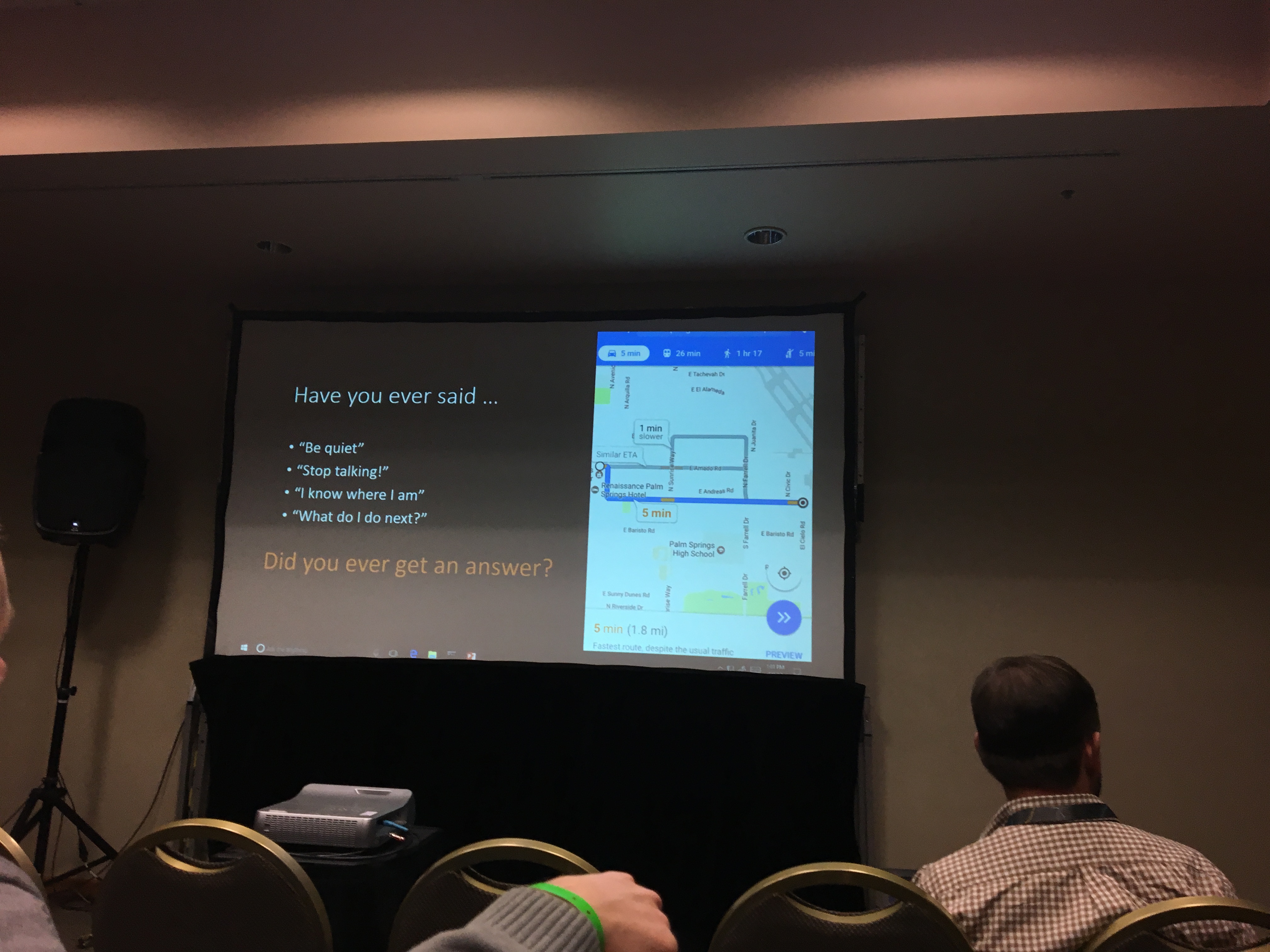 From there it was time to check out the "Using Voice Recognition and Chatbots to make Navigation Better" session. Chatbots are a hot topic and Christopher Marovec took us through this personal dev journey and quest to better understand how building code, bots and Artificial Intelligence came together during this complex project. He admitted that he didn't get as far as he wanted to for this talk but that didn't stop him from sharing valuable insight and leaving us with lots of great takeaways. I really appreciated the fluidness of the session and how Chris took us step by step through his thought process. As Chris highlighted, his the presentation of his project was fantastic example and good reminder of how developers can strive to "work out loud" with each other and encourage the openness of how they solved problems or what they get stuck on and why.