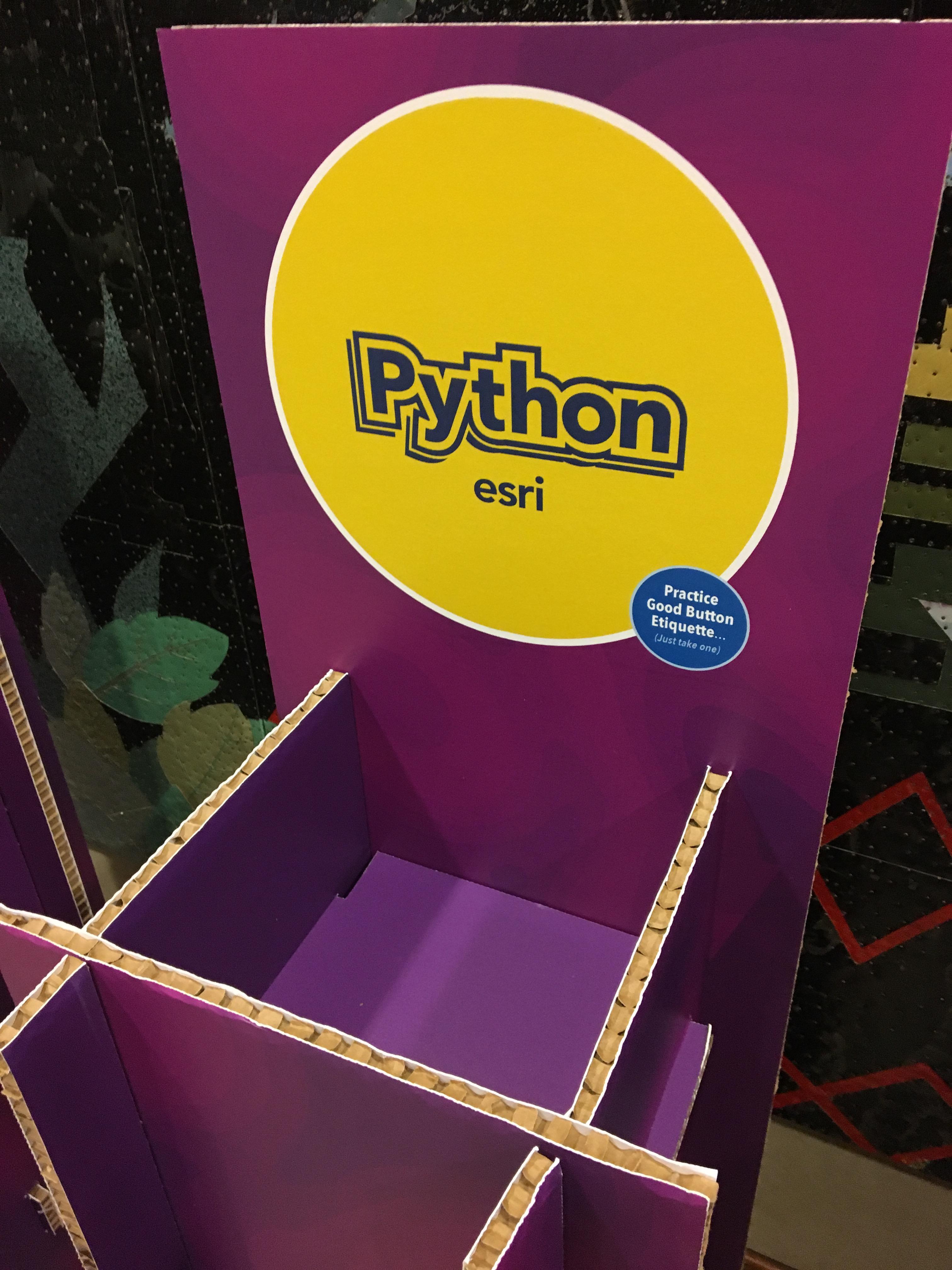 Then it was time to check in on the always popular conference button situation. Well, they're going fast and it looks like the most popular are the Python and Javascript buttons. Did you get your button swag yet? Which do you like the most this year? I also think we need to consider adding a GeoNet button to the mix. What do you think?