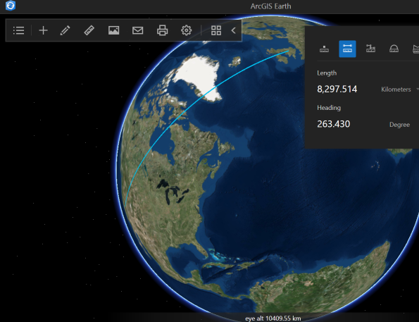 Showing measurement and the Great Circle route in ArcGIS Earth.