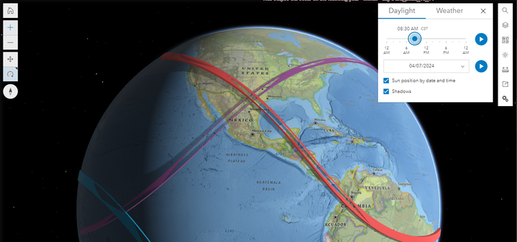Since the content and tools in the modern GIS cloud-based environment are so rich, additional topics can also be examined using GIS. For example, use the data and time slider in the 3D scene viewer to determine what the sun angle at the time of the solar eclipse will be where you are, as shown here:
