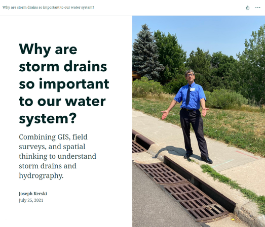 To support the project, I created a series of videos that walks an educator or student through the process of thinking about water from a spatial lens, to gathering resources, creating and deploying a field survey, creating 2D and 3D maps, performing spatial analysis, and creating a dashboard and a story map to communicate the results of the project. I assembled the videos in the following playlist, in the hopes that they will spark some creative ideas for you and others who watch them: