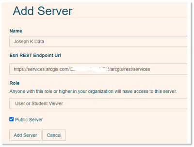 The REST endpoint of my own data layers came from my own ArcGIS Online organization’s server. I entered this REST endpoint in the Argis Console through the Add Server function as follows: