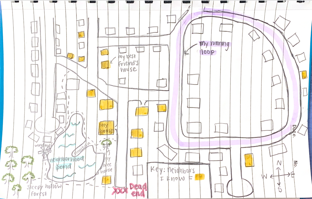 1. It helps anchor the idea that humans are spatial creatures, bound to time and space, and that our brains contain mental maps of meaningful places in our past. Our childhood maps are among the most detailed memory maps that we carry with us, of a very large scale, of a treasure trove of information: The route taken to school, your friend's house, or the public library, the mean (or nice) neighbor's dog, the tree you sat below and read next to, or climbed, even down to the cracks in your own driveway or sidewalk. An interesting discussion as well is comparing spatial memories of those who grew up in a single residence or town vs. those students who moved multiple times in childhood.