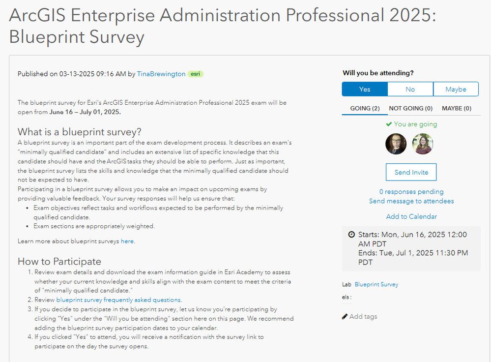 - Exam development participation opportunities are created in Esri Community for qualified candidates (more information below)